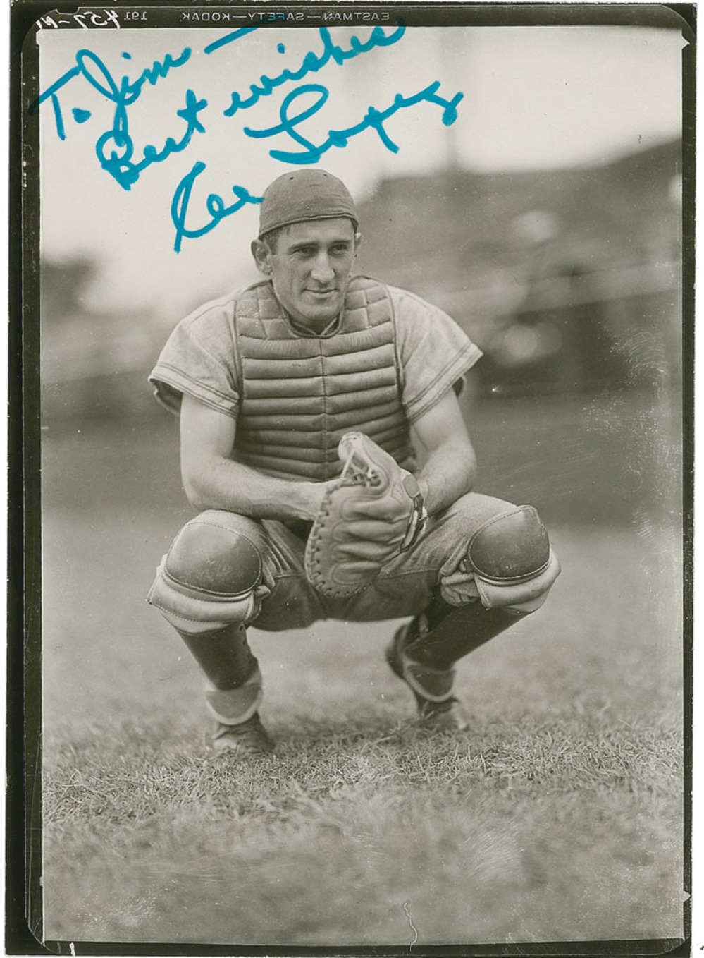 Baseball Hall of Famer. Heavyweight semi-gloss 5 x 7 photo of Lopez kneeling in his catcher’s gear, made from the original negative, signed and inscribed in blue felt tip 'To Jim — Best wishes, Al Lopez.' In fine condition. Pre-certified Steve Grad/PSA/DNA and RRAuction COA.