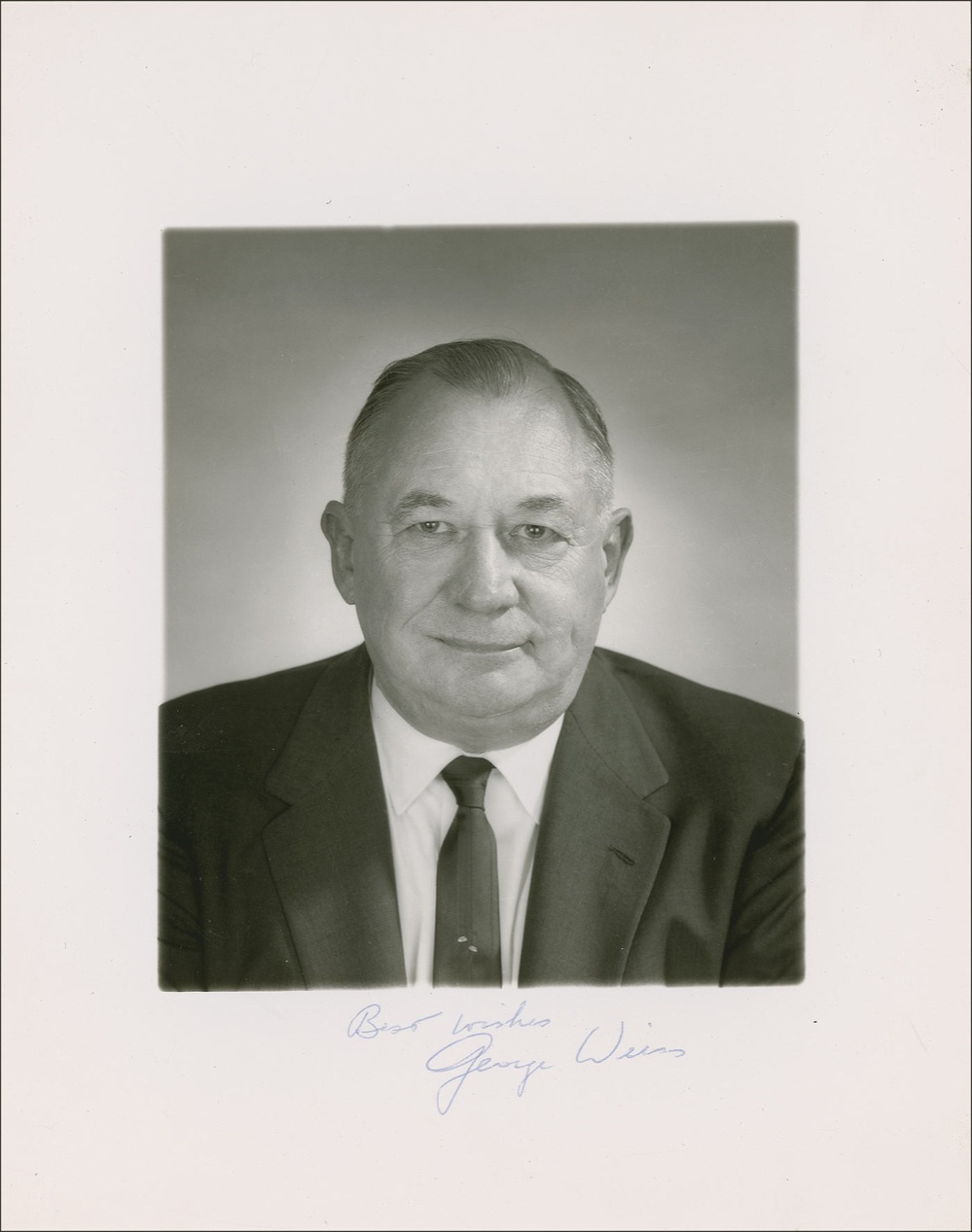 Baseball Hall of Famer (1895–1972) who was a long-time executive with the New York Yankees and New York Mets. Glossy 8 x 10 head-and-shoulders photo of Weiss in a suit and tie, signed in blue ink in the bottom white border. In very fine condition, with a few surface marks and areas of silvering to the darker areas. Pre-certified Steve Grad/PSA/DNA and RRAuction COA.
