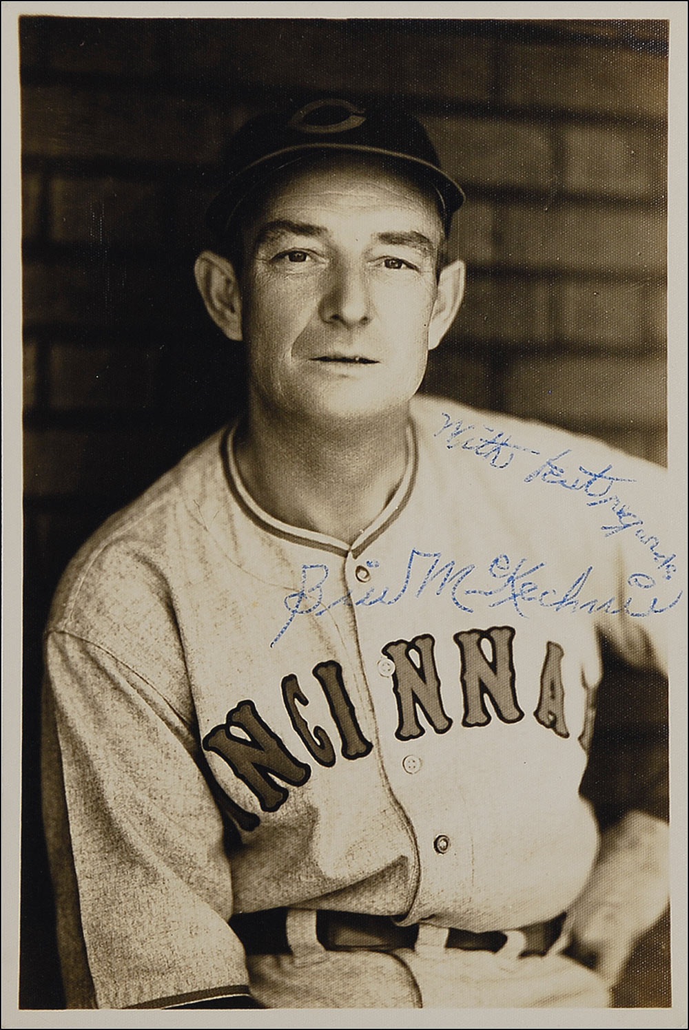Baseball Hall of Famer (1886–1965). Vintage matte-finish 4 x 6 photo of McKechnie in a Cincinnati Reds road jersey, signed in blue ink 'With best regards, Bill McKechnie.' Two George Brace photo credits are stamped on the reverse. In fine condition, with silvering to the darker areas. The longtime baseball manager, with 1892 wins, ranks eleventh on the all-time list. Pre-certified Steve Grad/PSA/DNA and RRAuction COA.