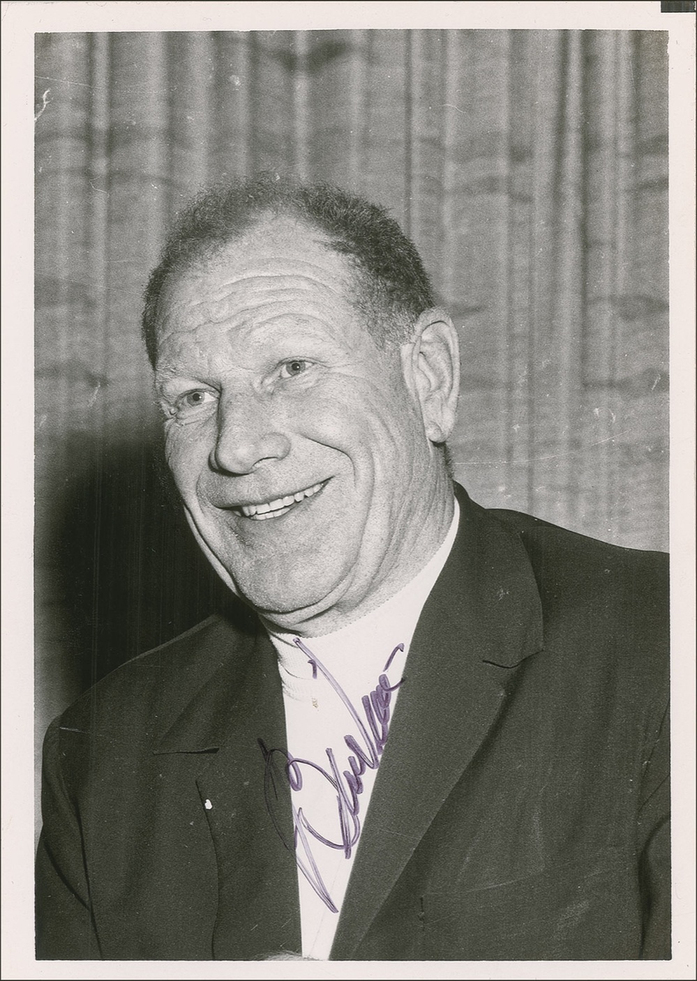 Baseball executive and Hall of Famer (1914–1986). Glossy 5 x 7 photo of a well-dressed Veeck in his later years, signed in black felt tip. Horizontal creases crossing his chest with one touching the end of his signature, otherwise fine condition. As the longtime owner of the Chicago White Sox, he signed the first black player in the American League and devised numerous infamous baseball promotions. Pre-certified Steve Grad/PSA/DNA and RRAuction COA.