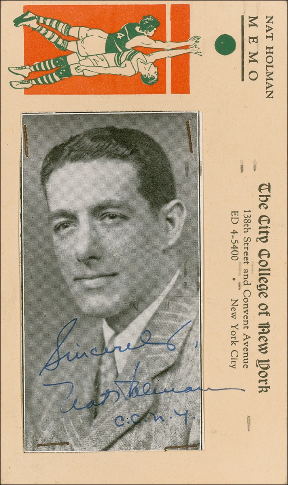 One of basketball’s most important innovators (1896–1995). Playing most of his career with the Original Celtics, Holman's extraordinary skills, a deft passer and brilliant floor leader, were innovative for the era, and made the Celtics virtually unbeatable. While barnstorming with the Celtics, Holman also handled the duties of coaching City College of New York. Small 2 x 4 photo affixed to a City College of New York postcard, signed across the image (spilling onto the card) in fountain pen “Sincerely, Nat Holman, C.C.N.Y.” Postmarked June 26, 1947, in New York City. In very good condition, with postal cancellations touching the end of the image and faint toning. Pre-certified Steve Grad/PSA/DNA and RRAuction COA.