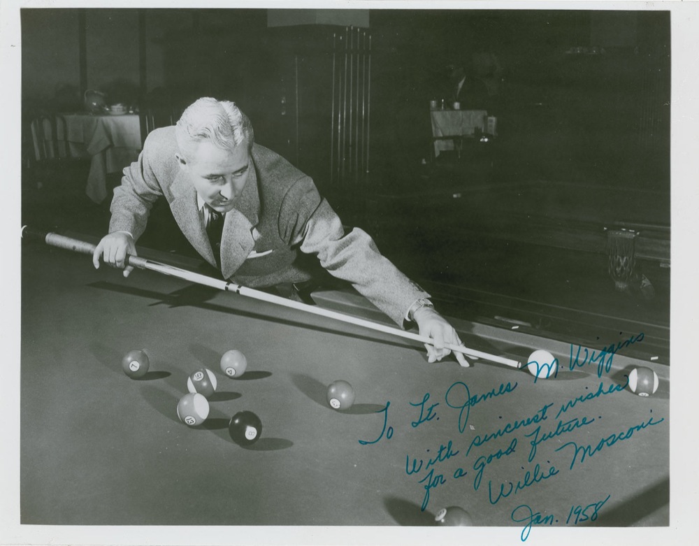 Billiards legend (1913-1993) who won the BCA World Championship of pool an amazing 15 times. Vintage glossy 10 x 8 photo of Mosconi shooting pool, signed and inscribed in blue ink 'To Lt. James M. Wiggins, with sincerest wishes for a good future. Willie Mosconi, Jan. 1958.' Scattered light crazing to finish, and creasing to right border, otherwise fine condition. Pre-certified Steve Grad/PSA/DNA and RRAuction COA.