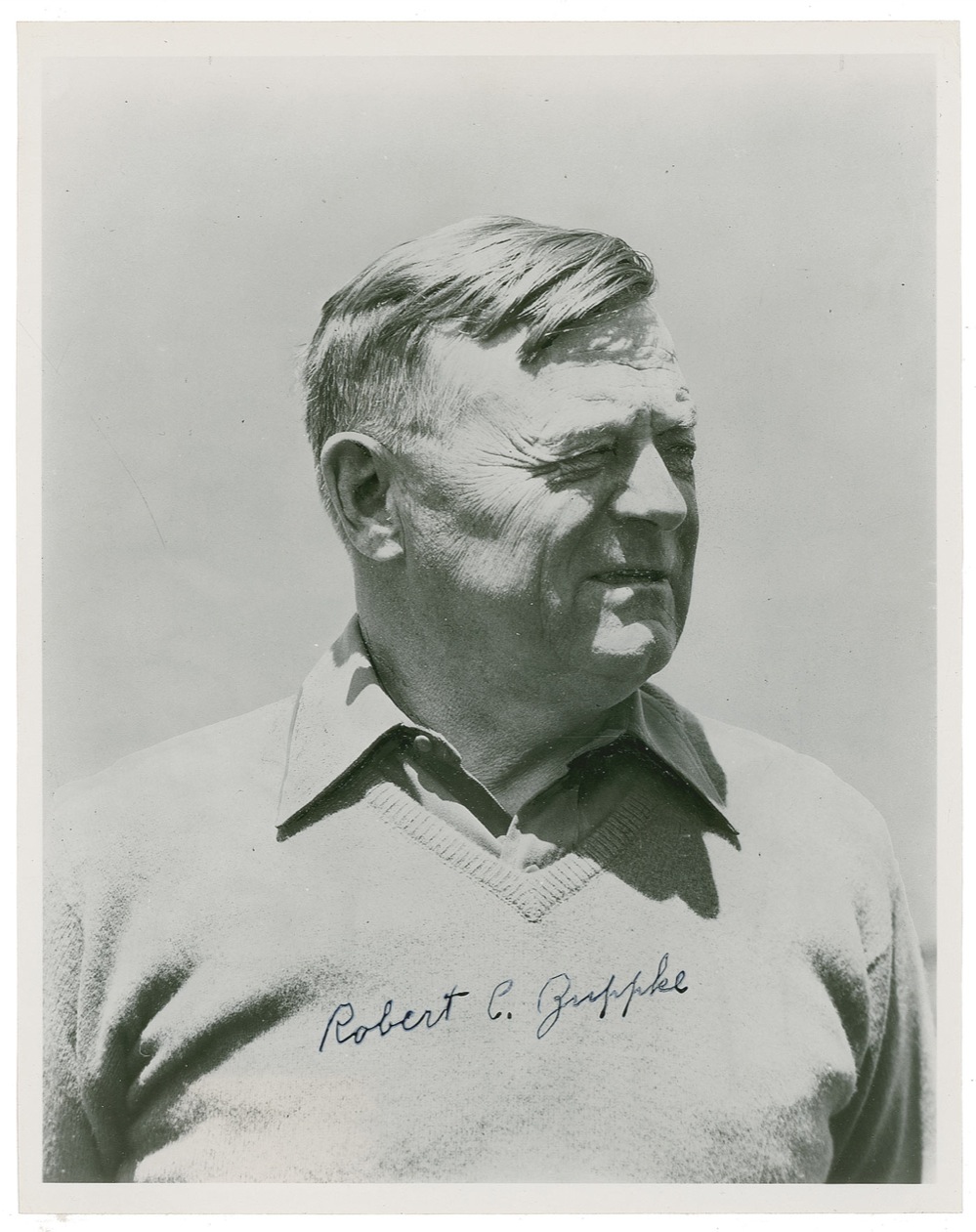 College Football Hall of Famer (1879-1957) who coached Illinois from 1913-1941. Vintage glossy 8 x 10 photo, signed in fountain pen. Scattered creases and surface marks, and light overall irregular adhesion to signature, not affecting legibility, otherwise fine condition. A scarce example of the innovator of the 'flea-flicker.' Pre-certified Steve Grad/PSA/DNA and RRAuction COA.