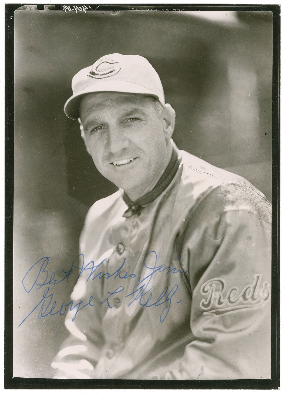 Baseball Hall of Famer. Heavyweight semi-gloss 5 x 7 photo of Kelly in his Reds uniform, made from the original negative, signed and inscribed in blue ballpoint 'Best wishes Jim, George L. Kelly.' In fine condition, with some mild silvering to edges. Pre-certified Steve Grad/PSA/DNA and RRAuction COA.