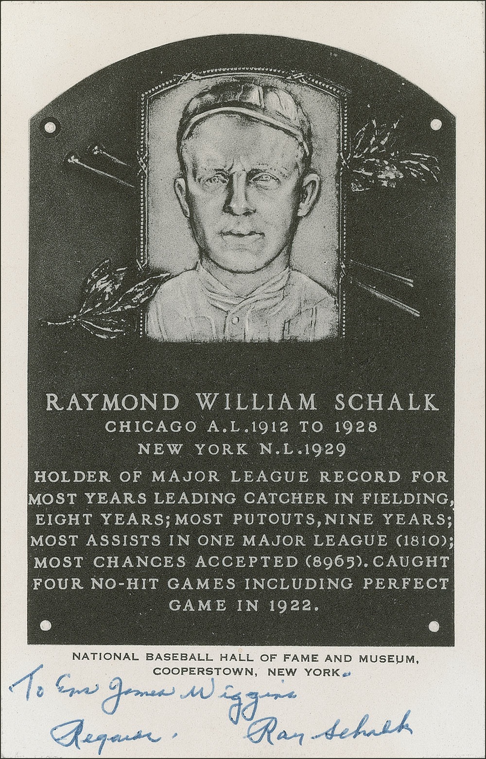 Baseball Hall of Famer who caught a Major League record four no-hitters in his career, including two in May 1914 and Charlie Robertson’s perfect game April 30, 1922. Black and white Hall of Fame plaque card, signed and inscribed at the bottom in blue ink, 'To James Wiggins, Regards, Ray Schalk.' In fine condition, a few light creases to lower right corner, slightly affecting a single letter of signature. Pre-certified Steve Grad/PSA/DNA and RRAuction COA.