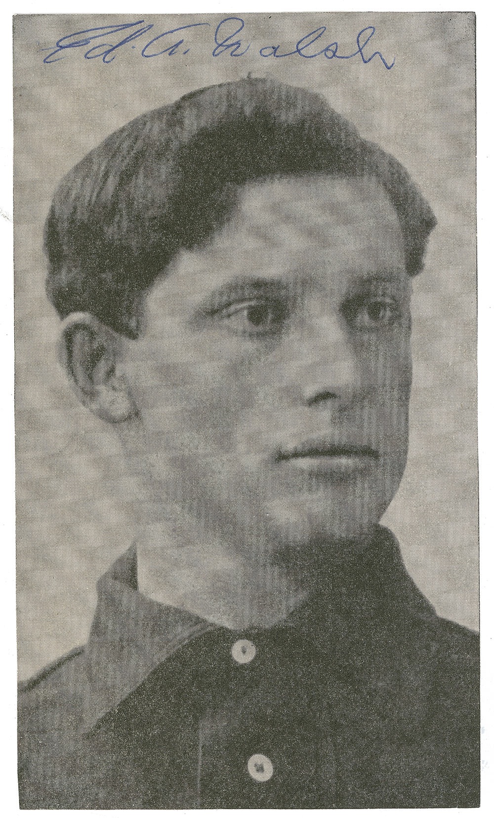 Baseball Hall of Famer (1881-1959) best known for his spitballs and for the forty-one-and-a-third innings he pitched in an eight-day span in 1908 in a futile attempt to capture a pennant for the White Sox. Scarce 4 x 7 paperstock photo of Walsh in his uniform, signed along the top in blue ballpoint, 'Ed A. Walsh.' In fine condition. Pre-certified Steve Grad/PSA/DNA and RRAuction COA.