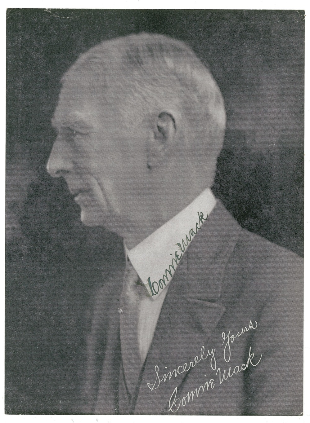 Vintage 7 x 9.5 paperstock photo of the smartly-dressed Mack in profile, signed in fountain pen. Photo also bears a pre-printed signature and sentiment. A couple of light brushes to last name of signature, and some stray ink flecks and small brush to first name of signature, otherwise fine condition. Pre-certified Steve Grad/PSA/DNA and RRAuction COA.