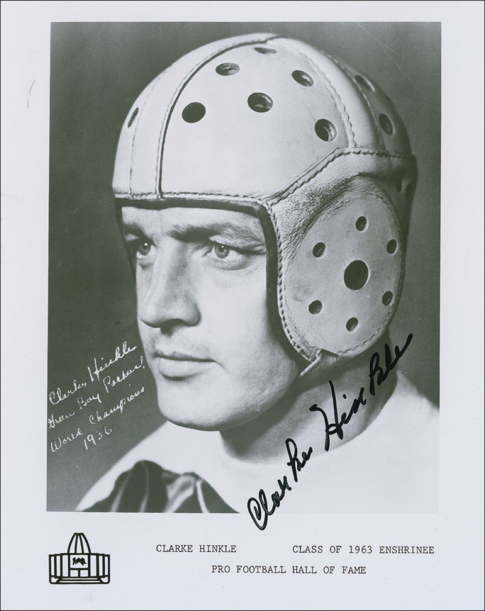 College and Pro Football Hall of Famer (1909–1988). Glossy 8 x 10 Football Hall of Fame enshrinement photo with a pre-printed signature, signed in black felt tip. In fine condition. Pre-certified Steve Grad/PSA/DNA and RRAuction COA.