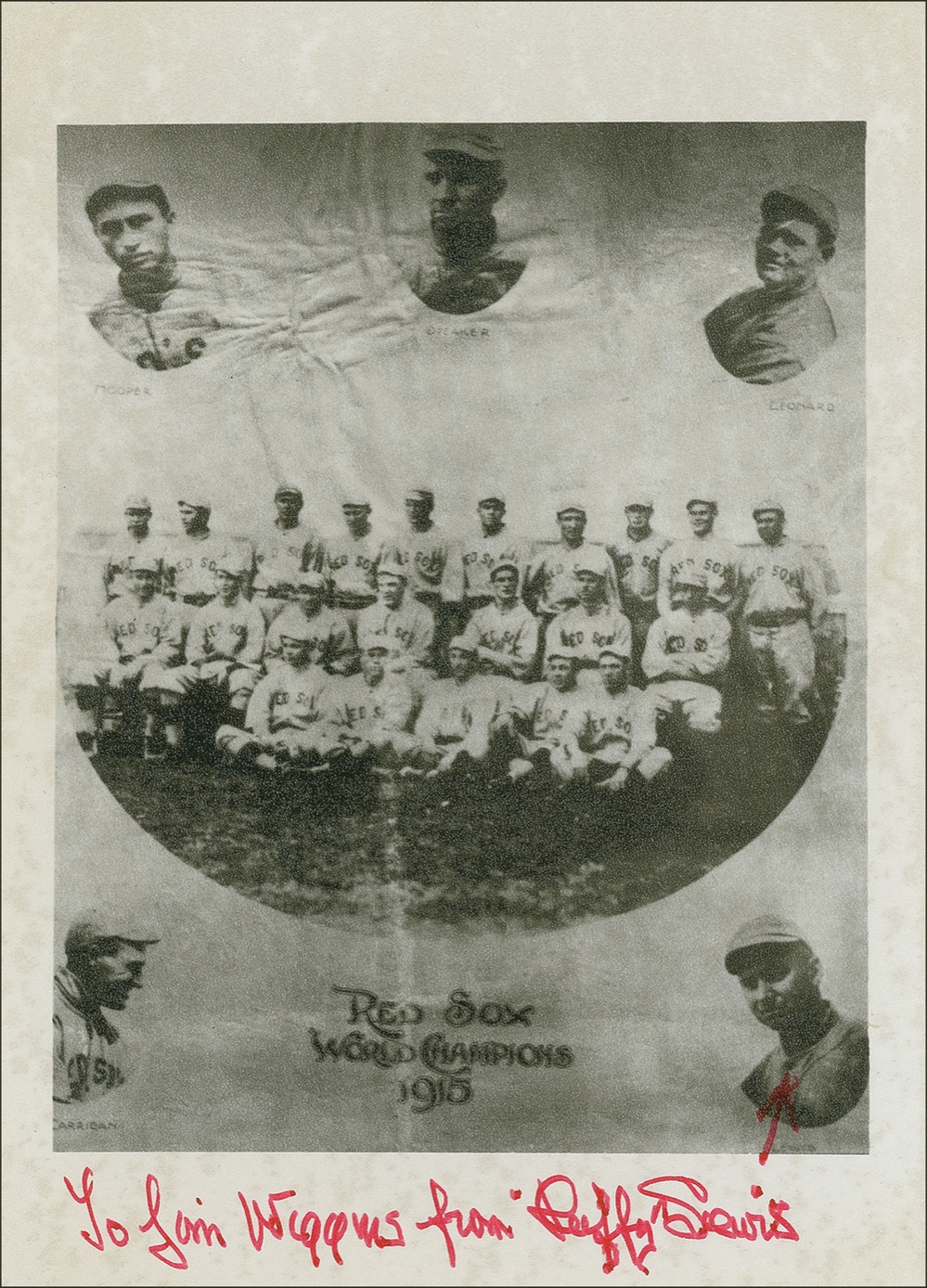 A member of the Boston Red Sox ‘Million Dollar Outfield,’ with Tris Speaker and Harry Hooper. Matte-finish 5 x 7 composite photo of the 1915 World Champion Red Sox, signed and inscribed in red felt tip 'To Jim Wiggins from Duffy Lewis,' with Lewis drawing an arrow to his image. In fine condition. Pre-certified Steve Grad/PSA/DNA and RRAuction COA.