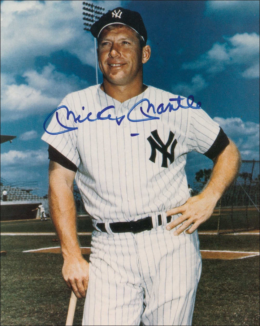 Color 8 x 10 cardstock photo of Mantle in his Yankee pinstripes, signed in blue felt tip, “Mickey Mantle.” In fine condition. Pre-certified Steve Grad/PSA/DNA and RRAuction COA.