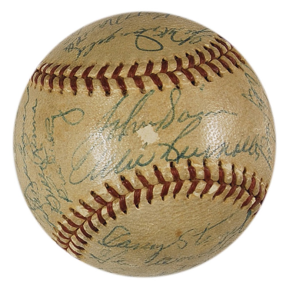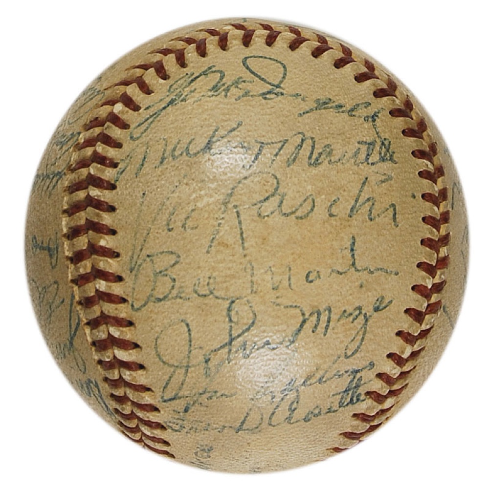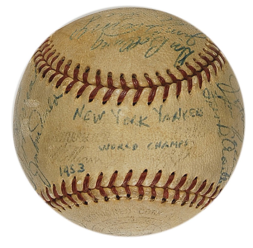 Official Reach American League baseball signed in blue ballpoint by 29 members of the 1953 World Champion New York Yankees. Signers include: Mickey Mantle, Gil McDougald, Vic Raschi, Johnny Sain (ss), Allie Reynolds (ss), Billy Martin, Johnny Mize, Joe Collins, Frank Crosetti, Don Bollweg, Jim Turner, Whitey Ford, Bob Kuzava, Willy Miranda, Tom Gorman, Andy Carey, Casey Stengel, Gene Woodling, Bill Miller, Ralph Houk, Phil Rizzuto, Irv Noren, Jim McDonald, Jerry Coleman, Art Schallock, Yogi Berra, Hank Bauer, Bill Renna, and Bill Dickey. Penned over the label is “New York Yankees World Champs 1953.” In very good condition, with uniform toning, a few signatures a couple shades light, but completely legible, and a few small scuffs. Pre-certified Steve Grad/PSA/DNA and RRAuction COA.