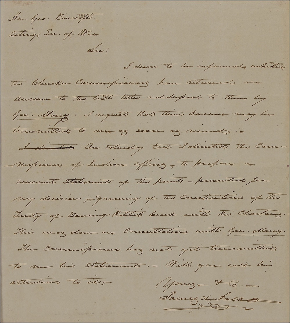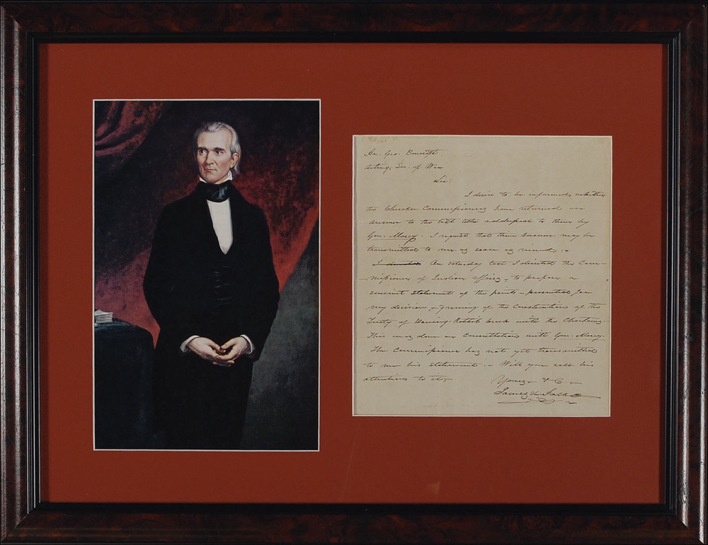 ALS as president signed “James K. Polk,” one page, 7 x 7.75, no date [circa 1846]. President Polk writes George Bancroft, his acting secretary of war, regarding the treaty of Dancing Rabbit Creek. In part: “I desire to be informed whether the Cherokee commissioners have returned an answer to the lost titles addressed to them by Gen. Marcy. I request that their answers may be transmitted to me…On Saturday last I directed the Commissioner of Indian Affairs to propose a succinct statement of the points—presented for my direction, growing of the Constitution of the Treaty of Dancing Rabbit Creek. This was done of consultation with Gen. Marcy. The commission has not yet transmitted to me his statement. Will you call his attention to it.” Matted with a colorized three-quarter-length portrait and framed to an overall size of 20 x 15.5. Intersecting folds (several additional vertical folds), two vertical folds passing through his name, otherwise fine condition.