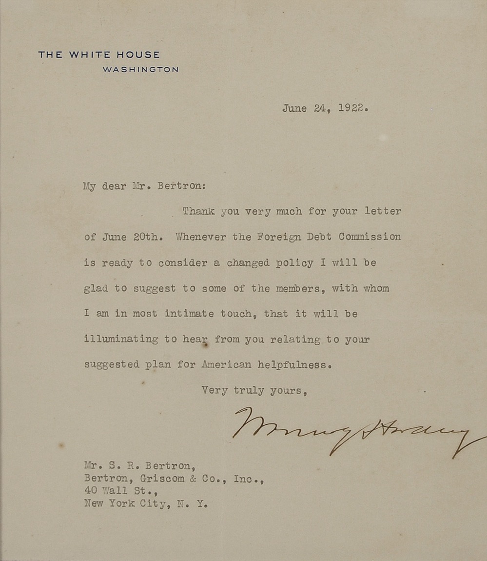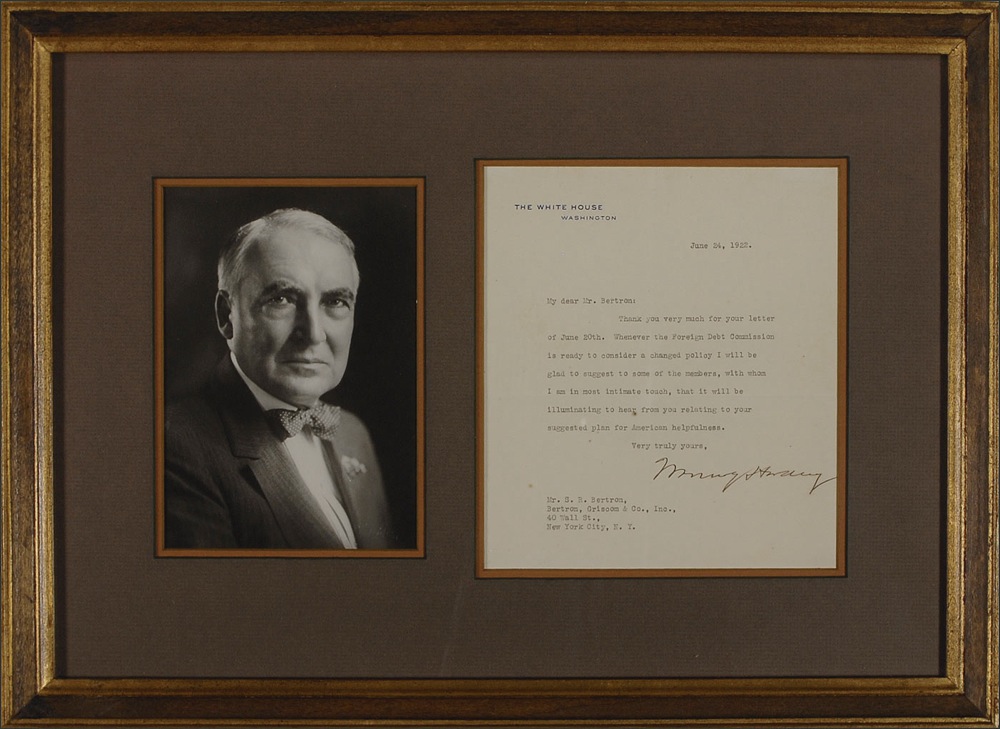 TLS as president, one page, 6.5 x 7.25, White House letterhead, June 24, 1922. Harding writes Wall Street financier S. R. Bertron. In full: “Thank you very much for your letter of June 20th. Whenever the Foreign Debt Commission is ready to consider a changed policy I will be glad to suggest to some of the members, with whom I am in most intimate touch, that it will be illuminating to hear from you relating to your suggested plan for American helpfulness.” Double-matted with a Pach Bros. photo and framed to an overall size of 18.5 x 13.5. In fine condition, with intersecting folds and a few small spots of foxing.