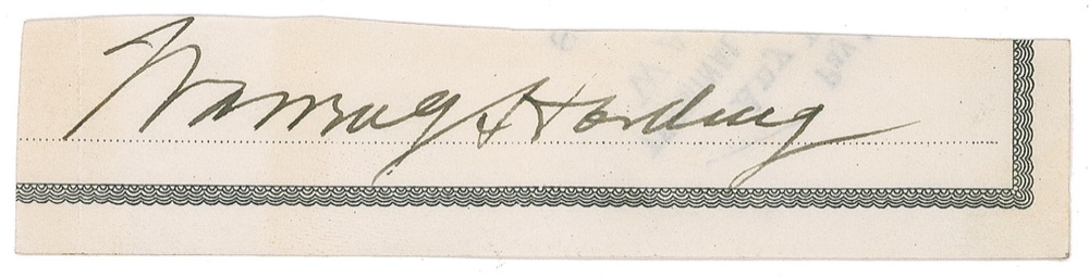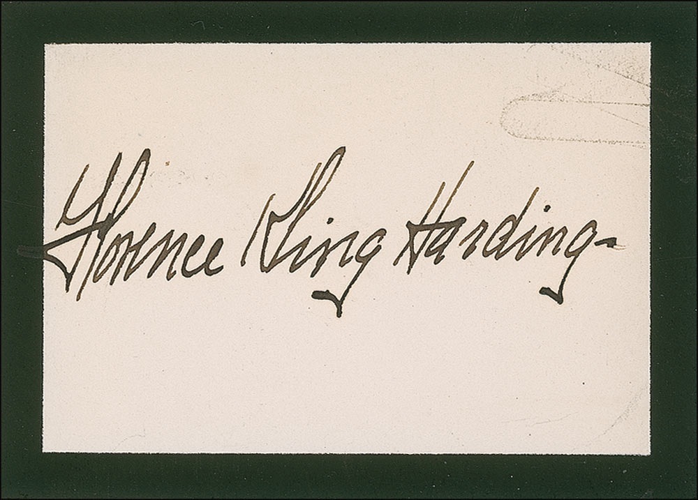 Ink signature, “Warren G. Harding,” on an off-white 4.5 x 1 slip clipped from a check; and an ink signature, “Florence Kling Harding,” on an off-white 3.25 x 2.5 black-bordered visiting card. Paperclip impressions to edge of Florence’s signature, and a vertical fold to left side of Warren’s slip, otherwise fine condition. Pre-certified John Reznikoff/PSA/DNA and RRAuction COA.