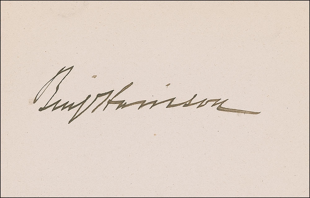 Ink signature, “Benj. Harrison,” on an off-white 3.75 x 2.5 card. In fine condition, a few light surface impressions. Pre-certified John Reznikoff/PSA/DNA and RRAuction COA.