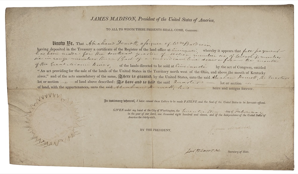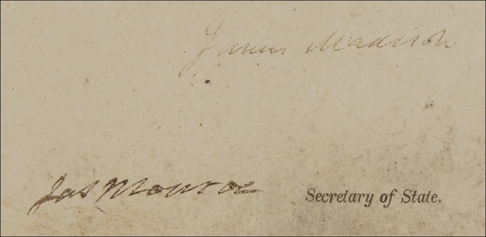 Partly-printed vellum DS, signed “James Madison” as president and “Jas. Monroe” as secretary of state, one page, 16 x 9.5, February 20, 1811. Land grant issued to Abraham Demott for a parcel of land under an “Act of Congress entitled ‘An Act providing for the sale of the Lands of the United States in the territory north-west of the Ohio and above the mouth of the Kentucky River.’” Intersecting folds, one through a single letter of Madison’s signature, Madison’s signature light, but legible, small hole at central junction of folds, and scattered toning and soiling, otherwise very good condition. The white seal is lightly worn and toned, but intact. Pre-certified John Reznikoff/PSA/DNA and RRAuction COA.