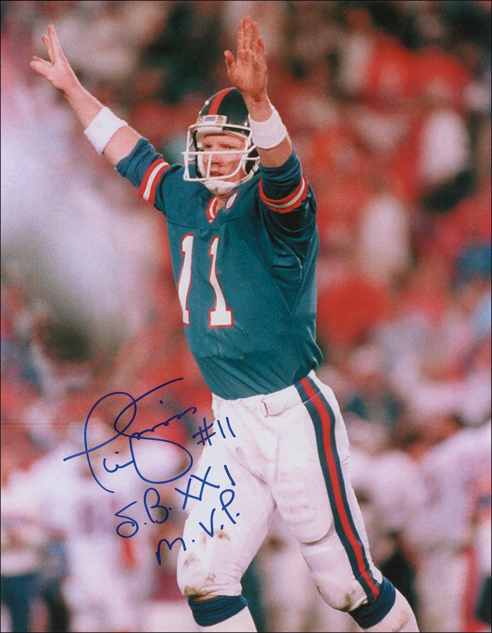 Color glossy 11 x 14 photo of Simms celebrating a touchdown with the Giants, signed in blue felt tip, “Phil Simms #11, SB XXI, MVP.” In very fine condition. Pre-certified Steve Grad/PSA/DNA and RRAuction COA.