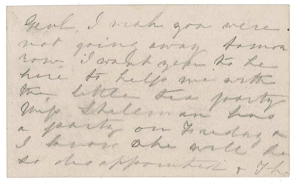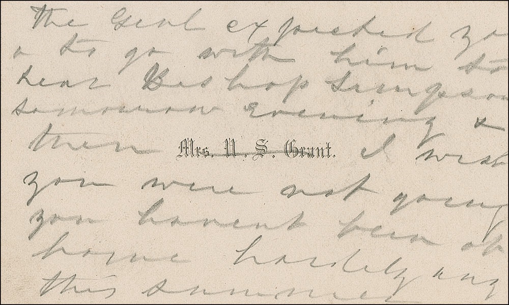 Wife of President Ulysses S. Grant (1826–1902) and First Lady from 1869 to 1877. Autograph letter, in pencil, on both sides of one of her 3.75 x 2.25 personal calling cards, no date, but likely September 18, 1868. Mrs. Grant writes on behalf of her husband, most likely to General Cyrus Comstock. In full: “Genl. I wish you were not going away tomorrow. I want you to be here to help me with the little tea party Miss Shellman has a party on Friday & I know she will be so disappointed. The Genl. expected you to go with him to hear Bishop Simpson tomorrow evening & then I wish you were not going. You haven’t been at home hardly a day this summer.” In fine condition, with expected light overall soiling.