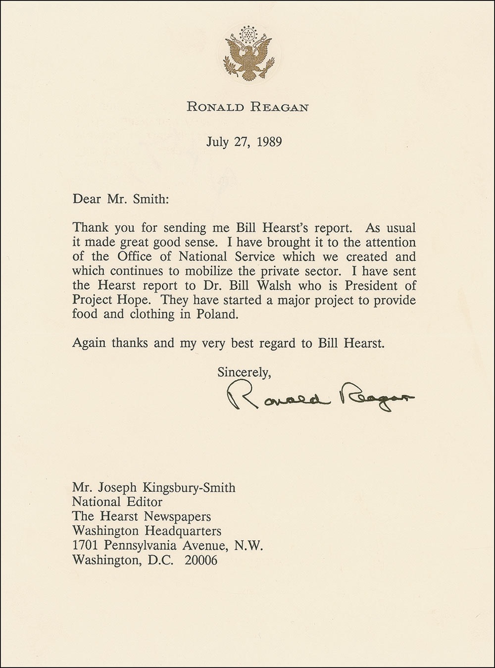 TLS, one page, 6.5 x 8.5, personal letterhead, July 27, 1989. Reagan writes to Joseph Kingsbury-Smith. In full: “Thank you for sending me Bill Hearst's report. As usual it made great good sense. I have brought it to the attention of the Office of National Services which we created and which continues to mobilize the private sector. I have sent the Hearst report to Dr. Bill Walsh who is President of Project Hope. They have started a major project to provide food and clothing in Poland. Again thanks and my very best regard to Bill Hearst.” Kingsbury-Smith was a journalist who had shared the 1956 Pulitzer Prize for Distinguished Reporting of International Affairs with William Randolph Hearst, Jr. and Frank Conniff. In fine condition, with a few light wrinkles. Accompanied by the original mailing envelope. Walsh was the founder and leader of Project Hope for 34 years. Pre-certified PSA/DNA and RRAuction COA.