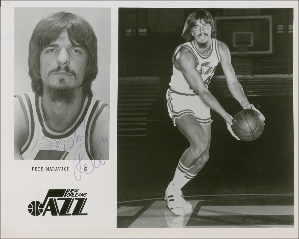 Spectacular athletic showman (1947–1988) who did much to popularize the game of basketball in the 1970s. He died of a heart attack at the age of forty while playing a pickup three-on-three game in a California gym. Maravich was inducted into the Basketball Hall of Fame in 1987 and named one of The 50 Greatest Players in National Basketball Association History in 1996. Glossy 10 x 8 New Orleans Jazz composite photo, signed in purple felt tip, “’Pistol Pete.’” In fine condition. It was during his time in New Orleans that Maravich peaked as an NBA superstar. Pre-certified Steve Grad/PSA/DNA and RRAuction COA.