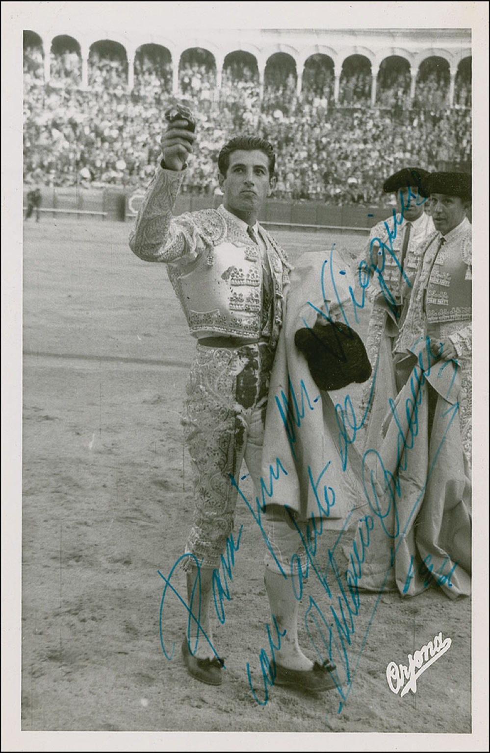 Famous bullfighter (1932-1998) who was a long time friend with Ernest Hemingway. Hemingway wrote an account of Ordonez's rivalry with the matador Luis Miguel Dominguin (also Ordonez's brother in law) titled The Dangerous Summer. Vintage glossy 4.75 x 7.25 photo of Ordonez acknowledging a capacity crowd, signed and inscribed in fountain pen in Spanish and dated 1961. In fine condition, with a few scattered edge and corner creases. RRAuction COA.