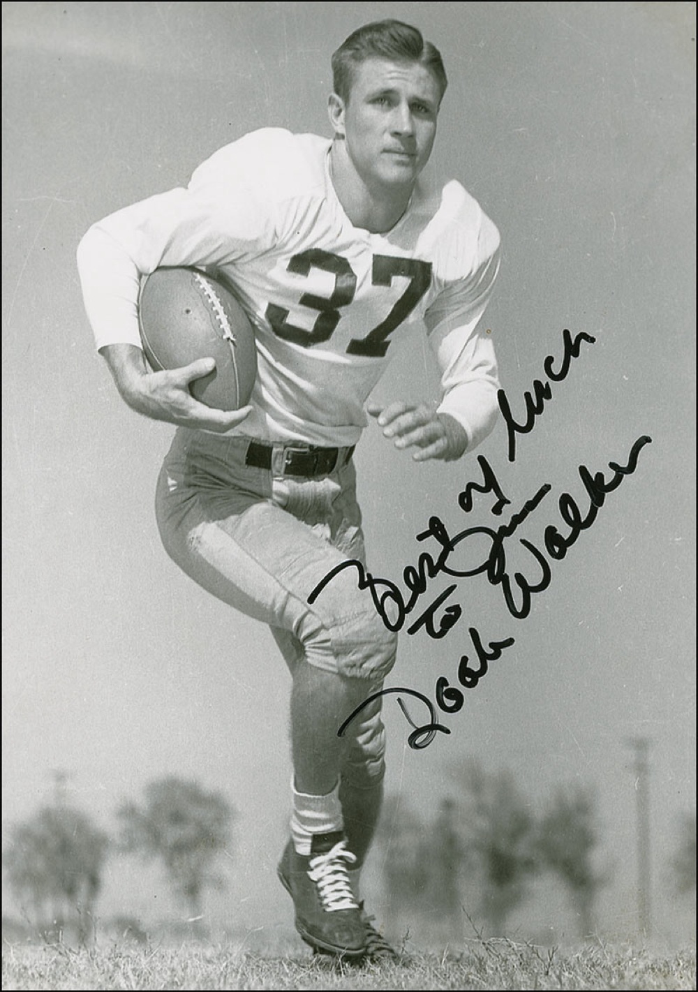 Heisman trophy winner and Football Hall of Famer (1927-1998). Glossy 5 x 7 photo of Walker running with the ball, signed and inscribed in black felt tip “Best of luck to Jim, Doak Walker.” In fine condition. Pre-certified Steve Grad/PSA/DNA and RRAuction COA.