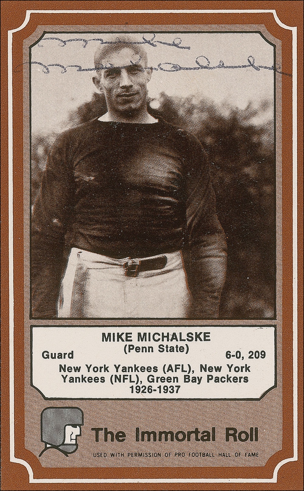 An athlete of exceptional stamina and durability, Michalske followed a Hall of Fame career in professional football with an equally notable span as a teacher and coach. His lightning-fast speed as a player led many to consider him one of the greatest guards in professional football history. Immortal Roll football trading card by Fleer, signed on the front in black ballpoint. In fine condition. Pre-certified Steve Grad/PSA/DNA and RRAuction COA.