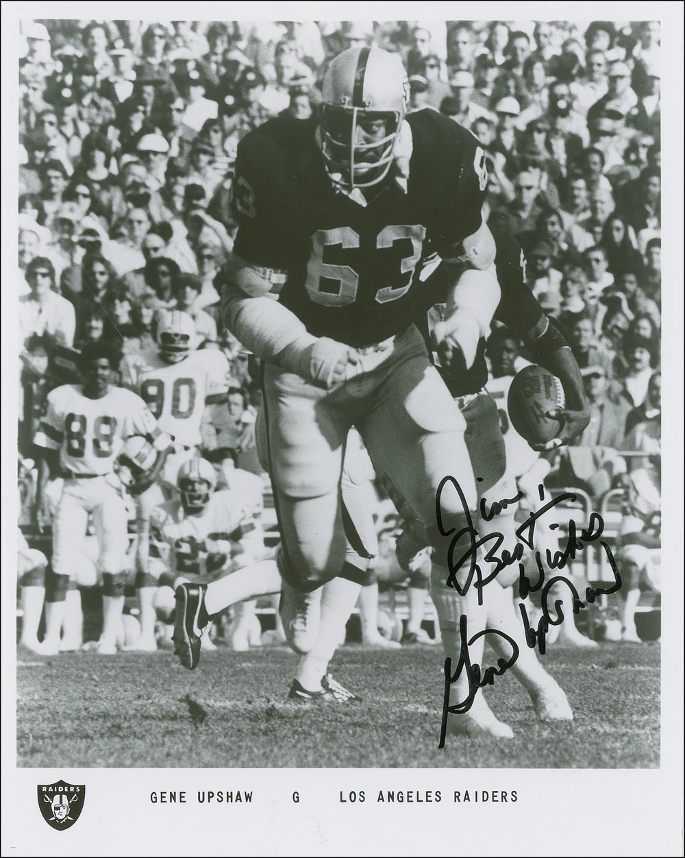 Hall of Famer who played for the Oakland Raiders and was executive director of the NFL’s Players' Association. Glossy 8 x 10 Los Angeles Rams promotional photo of Upshaw in action, signed and inscribed in black felt tip “Jim, Best Wishes, Gene Upshaw.” In fine condition. Pre-certified Steve Grad/PSA/DNA and RRAuction COA.