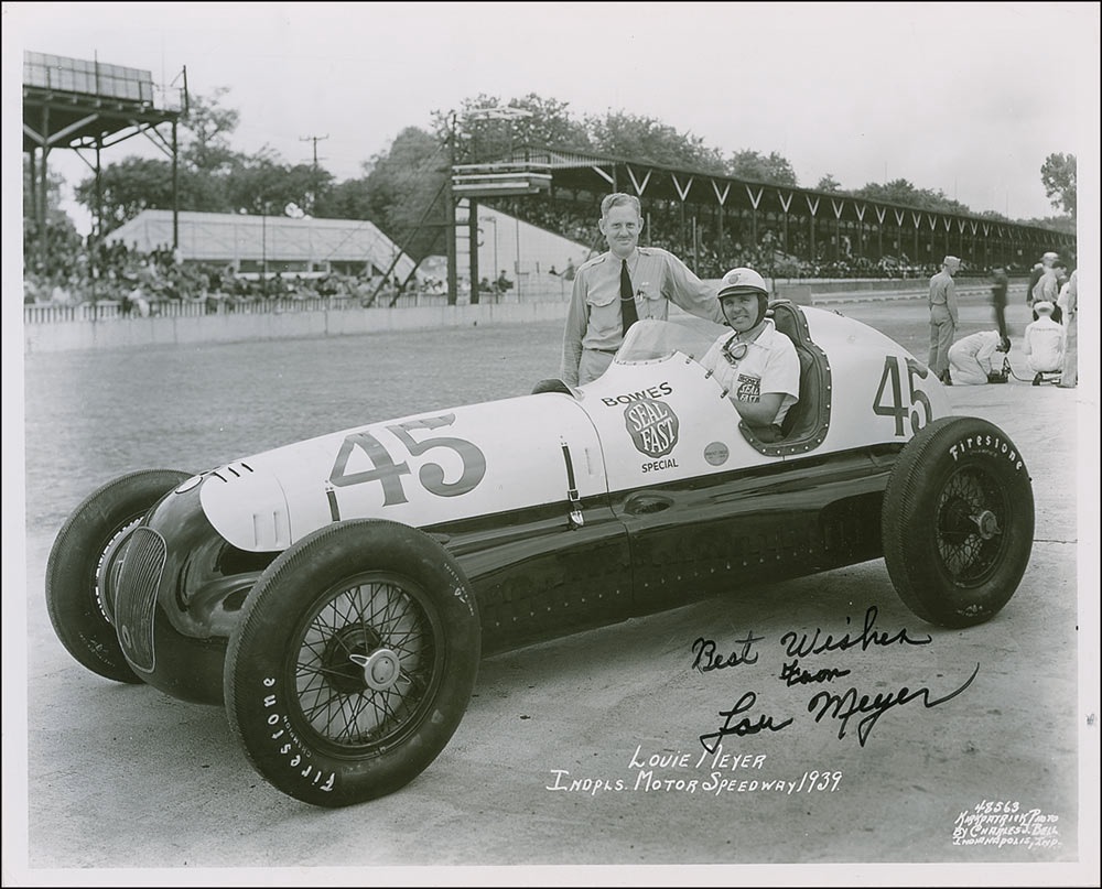 Pre-World War II three-time Indy 500 winner. Glossy 10 x 8 photo seated in his car at the 1939 race, signed in black ink, “Best Wishes from Lou Meyer.” In fine condition, with few creases, bends, and area of light staining over the first part of his name. Pre-certified Steve Grad/PSA/DNA and RRAuction COA.