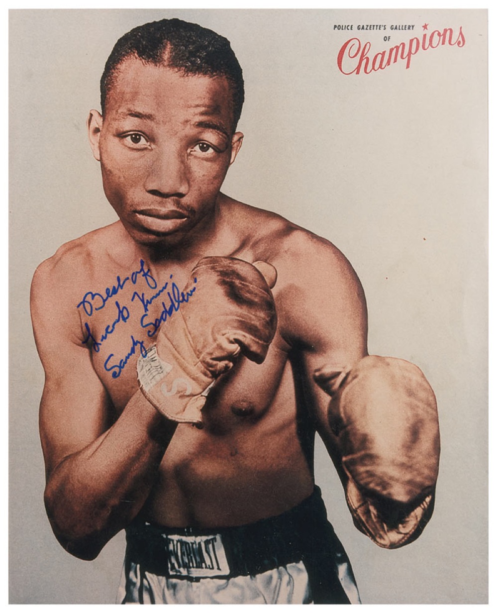 Boxing Hall of Famer (1926–2001) and two-time featherweight world champion. Color glossy 8 x 10 photo of Saddler in his prime, signed and inscribed in blue felt tip “Best of luck Jim, Sandy Saddler.” In fine condition. Pre-certified Steve Grad/PSA/DNA and RRAuction COA.