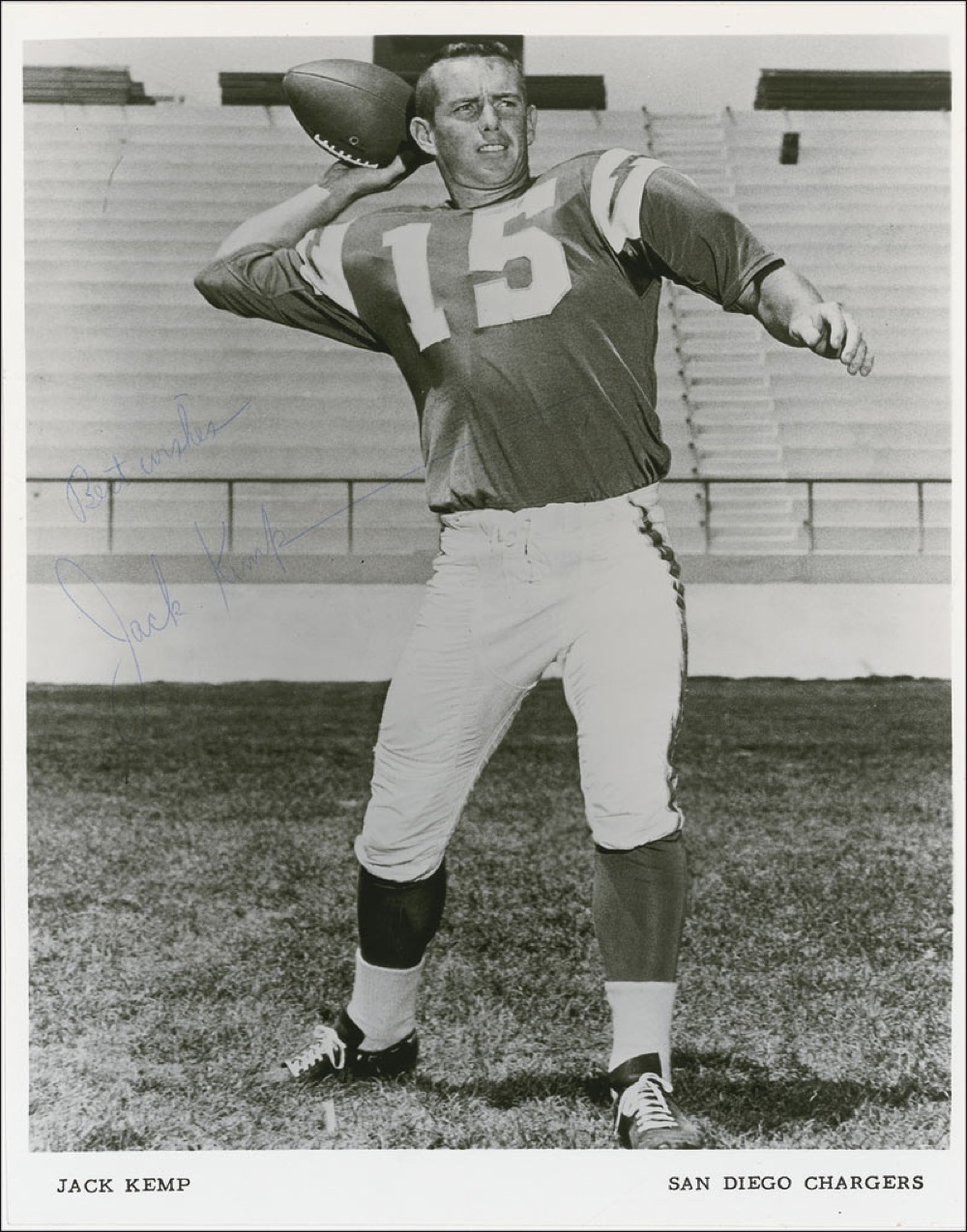 Glossy 8 x 10 San Diego Chargers publicity photo, signed in blue ballpoint “Best wishes, Jack Kemp.” In fine condition with the signature a shade light. Pre-certified Steve Grad/PSA/DNA and RRAuction COA.