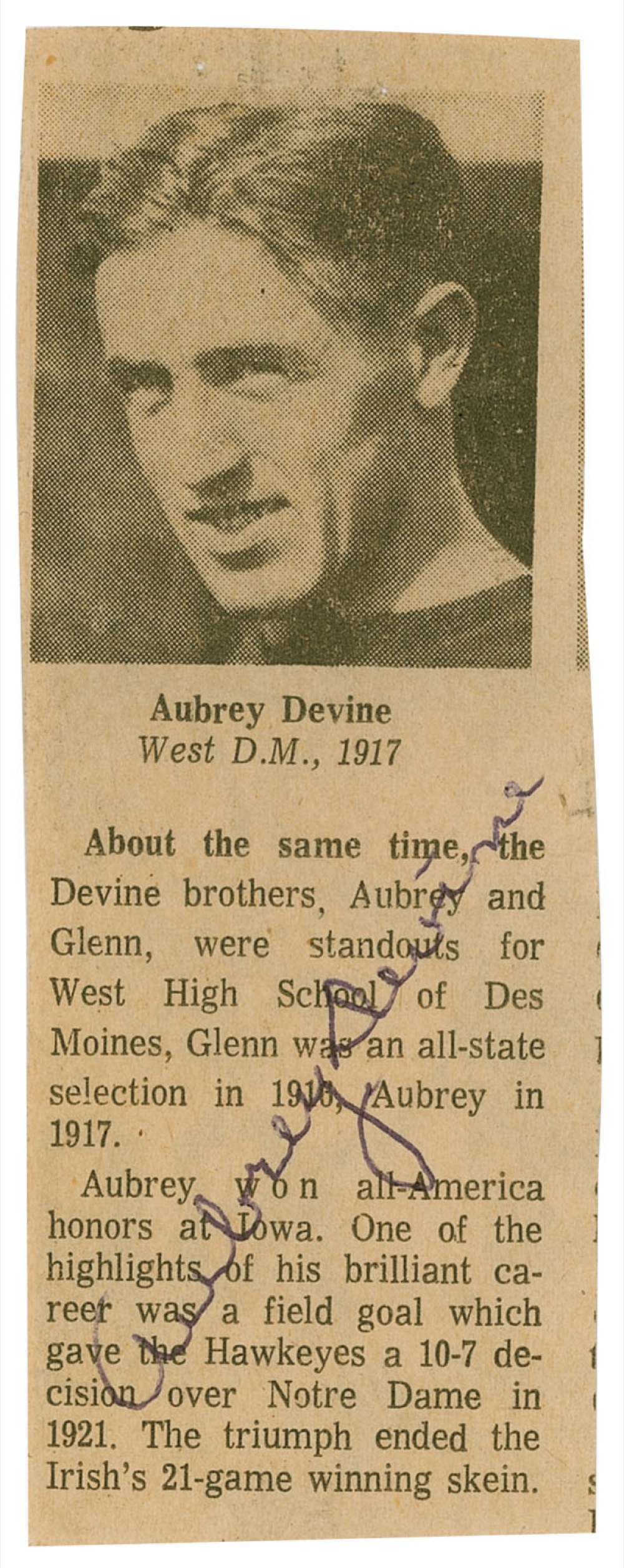 College Football Hall of Famer (1897–1981) who played for Iowa. Clipped 1.75 x 5 newspaper photo, signed in blue ballpoint. In fine condition, with a uniform shade of light toning. Pre-certified Steve Grad/PSA/DNA and RRAuction COA.