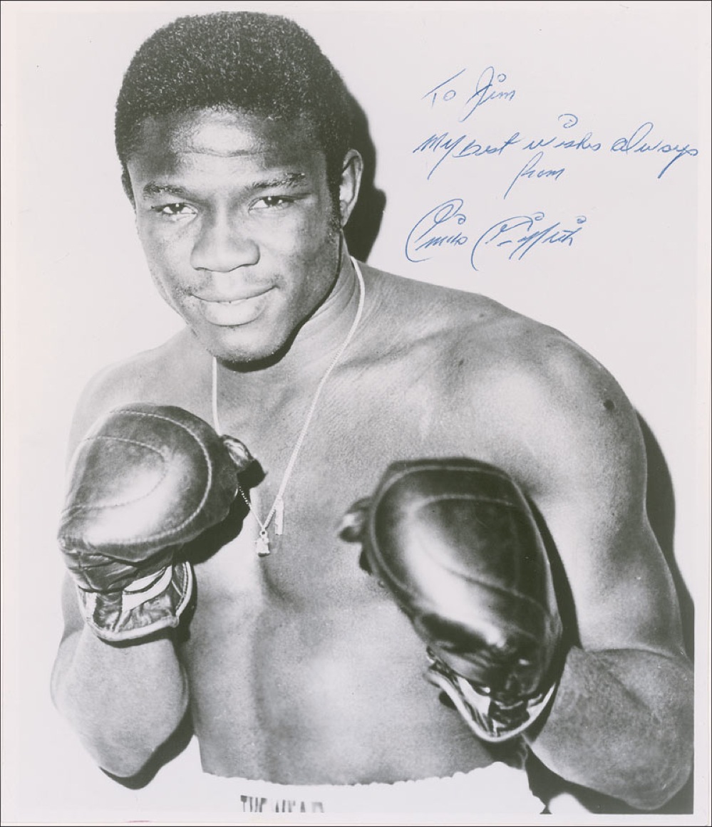 Glossy 7.25 x 8.5 photo, signed and inscribed in blue ballpoint “To Jim, my best wishes always from Emile Griffith.” Date-stamed on the reverse “THU OCT 20 1966.” In fine condition, with a few small creases, surface marks, and trimmed edges. Pre-certified Steve Grad/PSA/DNA and RRAuction COA.