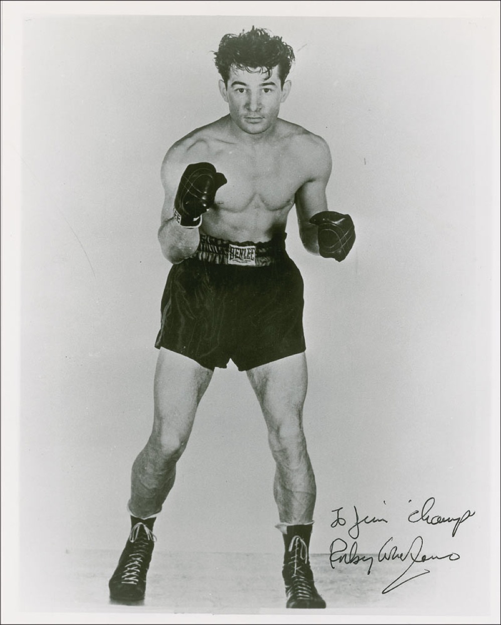 Glossy 8 x 10 photo of Graziano in his prime, signed and inscribed in black ink “To Jim, Champ Rocky Graziano.” Creasing to top corners and edge, otherwise fine condition. Pre-certified Steve Grad/PSA/DNA and RRAuction COA.
