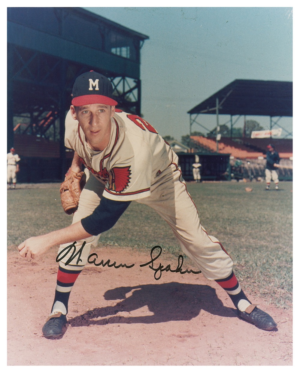 Color glossy 8 x 10 photo of Spahn warming up for the Milwaukee Braves, signed in black felt tip. In fine condition, with a few faint surface marks. Pre-certified Steve Grad/PSA/DNA and RRAuction COA.