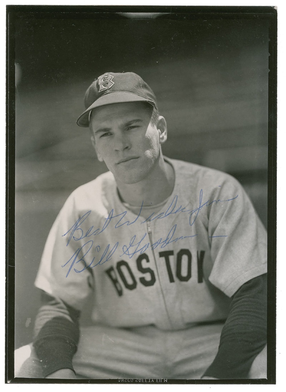 Infielder who spent much of his career with the Boston Red Sox. Unique heavyweight semi-gloss 5 x 7 photo of Goodman in his Red Sox uniform, signed and inscribed in blue ballpoint “Best wishes Jim, Bill Goodman.” In fine condition. Pre-certified Steve Grad/PSA/DNA and RRAuction COA.