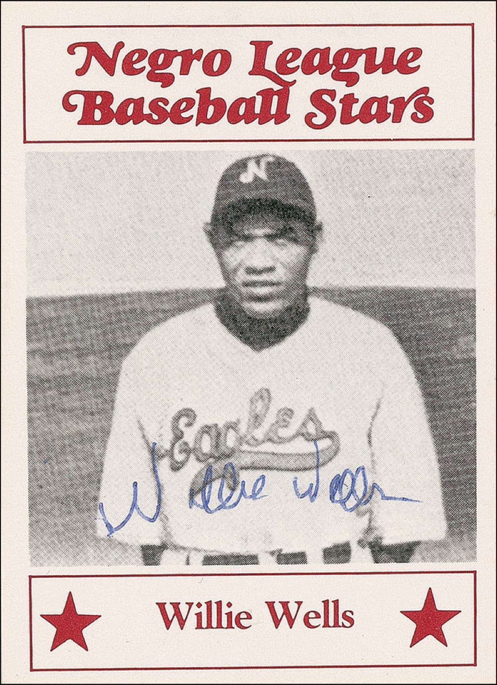 Considered by most to be the greatest Negro League shortstop of all time. Negro League Baseball Stars trading card from 1986, signed on the front in blue ballpoint. In fine condition. Pre-certified Steve Grad/PSA/DNA and RRAuction COA.