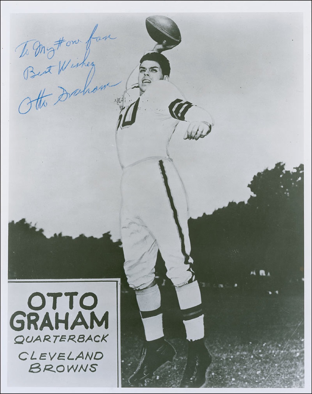 Pro Football Hall of Famer (1921-2003). Glossy 8 x 10 photo of Graham preparing to throw a pass, signed and inscribed in blue ballpoint “To my # one fan, Best wishes, Otto Graham.” In fine condition. Pre-certified Steve Grad/PSA/DNA and RRAuction COA.
