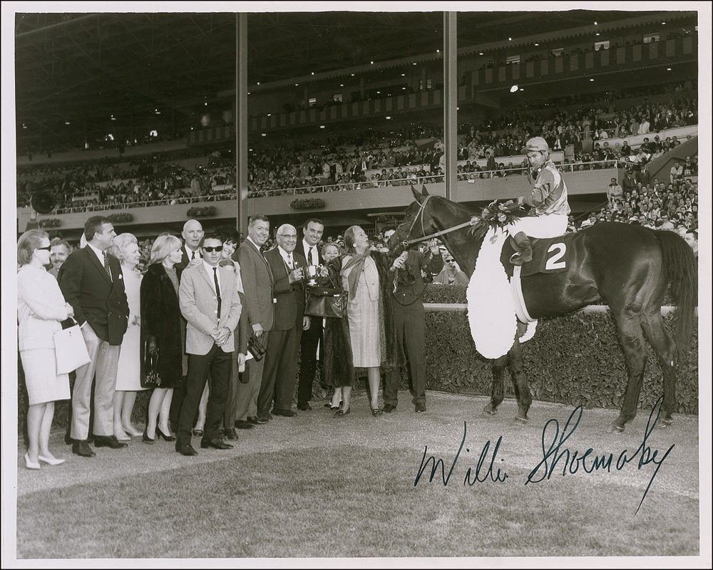 Glossy 10 x 8 photo of Shoemaker atop Pretense after winning the San Antonio Handicap, signed in black felt tip. In fine condition. Pre-certified Steve Grad/PSA/DNA and RRAuction COA.
