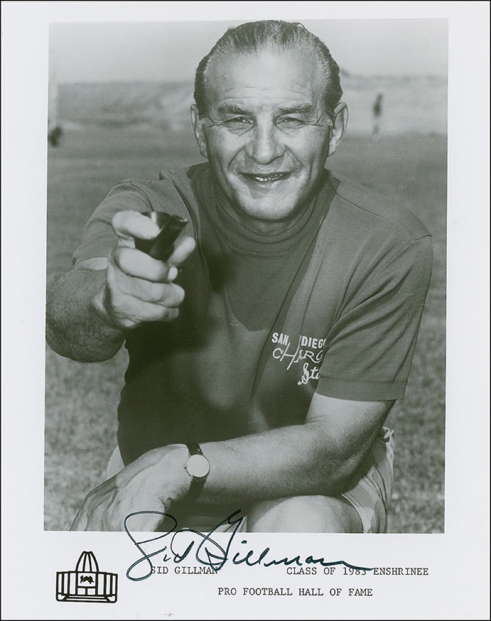 Pro Football Hall of Famer (1911-2003) whose insistence on stretching the football field by throwing deep down field passes, instead of short passes to running backs or wide receivers at the sides of the line of scrimmage, made football into the modern game that it is today. Glossy 8 x 10 Hall of Fame Induction photo, signed in black felt tip. In very fine condition. Pre-certified Steve Grad/PSA/DNA and RRAuction COA.