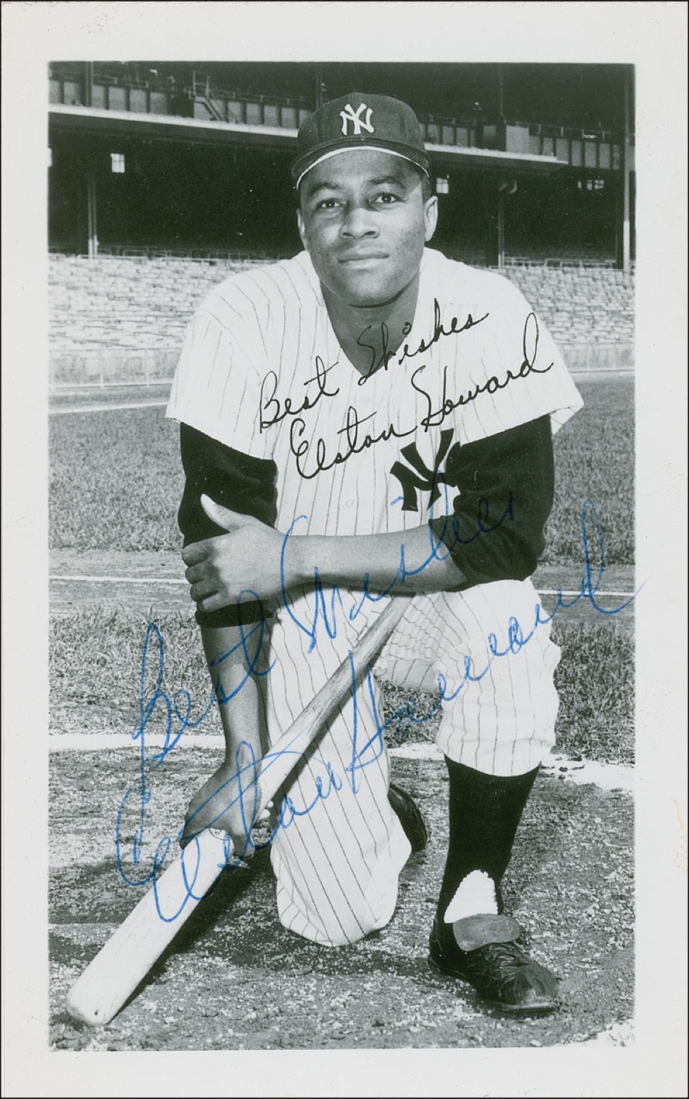 The first African American player on the Yankees roster, he was named the American League’s Most Valuable Player in 1963. Glossy 3.5 x 5.5 photo of Howard posing in his Yankee pinstripes, signed in blue ballpoint, “Best wishes, Elston Howard.” Photo also bears a pre-printed signature and sentiment. In fine condition. Pre-certified Steve Grad/PSA/DNA and RRAuction COA.