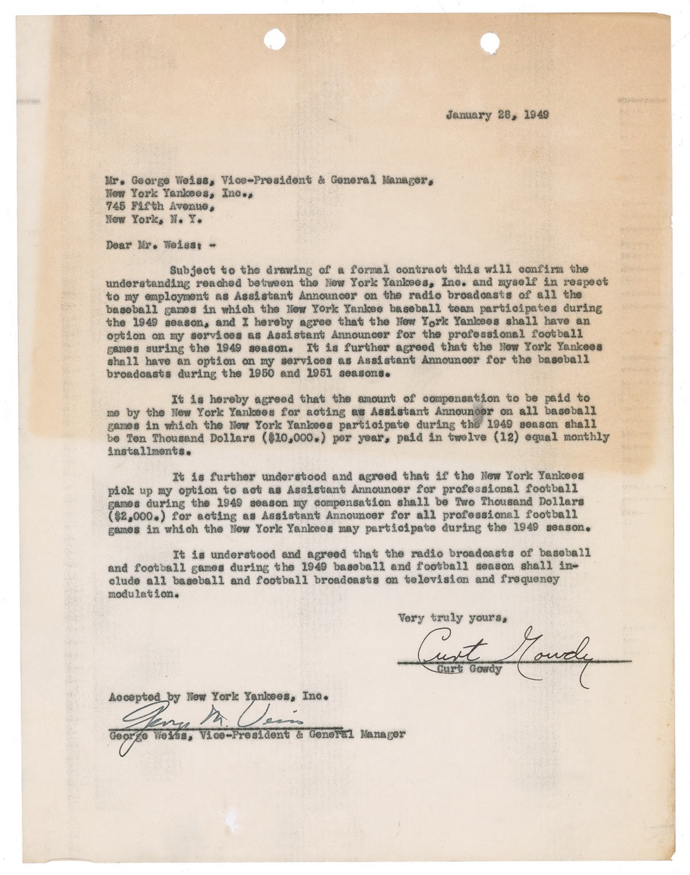 DS, one page, 8.5 x 11, January 28, 1949. Agreement between Gowdy and the New York Yankees for Gowdy to to be an announcer for the Yankees games during the 1949 season, with options for the 1950 and 51 season, with Gowdy receiving a salary of $10,000 per year. In very good condition, with punch holes to top edge, and a block of toning over upper portion of page. Pre-certified Steve Grad/PSA/DNA and RRAuction COA.