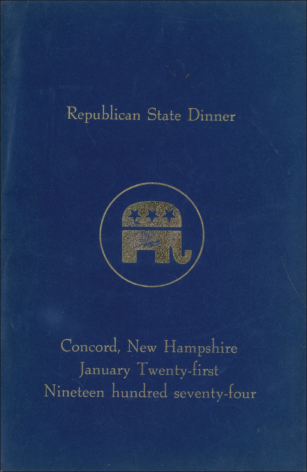 Program from the New Hampshire Republican State Dinner, held on January 21, 1974, in Concord, 6.25 x 9.5, signed beneath his image in blue felt tip. In fine condition. RRAuction COA.