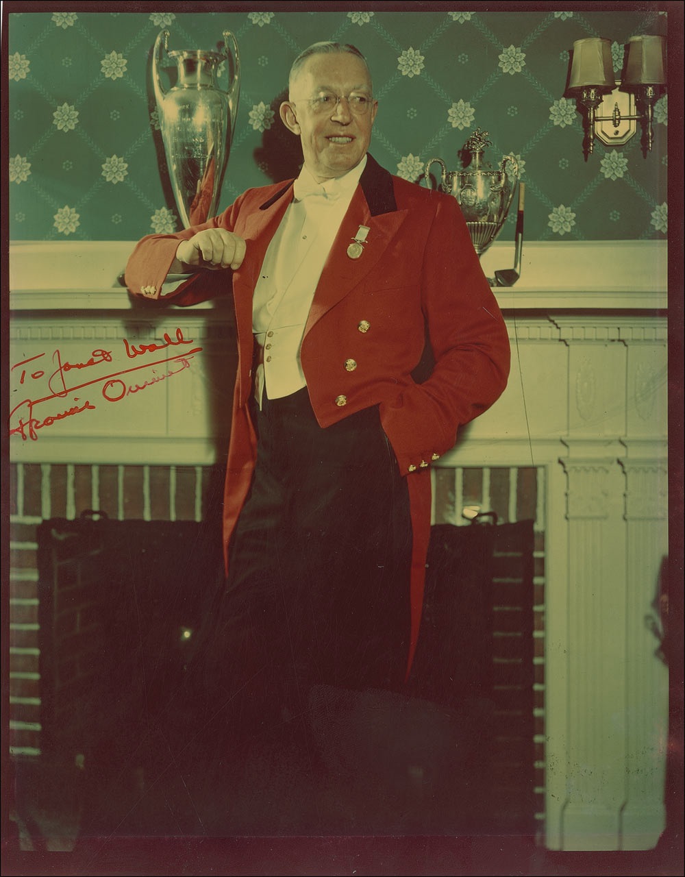 At the 1913 US Open at the Country Club, Ouimet (1893–1967), a former caddy, changed the perceptions of an entire sport with a stunning triumph that captured the imagination of sports fans across the globe. Color vintage glossy 7.75 x 10 photo of Ouimet taken at his home in Wellesley, Massachusetts with some of his golf trophies on the mantel, signed and inscribed in red felt tip “To Jonas Wall, Francis Ouimet.” In fine condition, with surface impressions and the end of his signature a little light due to the extreme glossiness of the photo. In 1951, he was selected to be the first non-Briton Captain of the Royal and Ancient Golf Club of St. Andrews in Scotland. The photo, in which he is wearing the traditional red Captain’s jacket along with the Queen Adelaide medal, was used to create his official oil painting that hung in the clubhouse at St. Andrews for years. Pre-certified Steve Grad/PSA/DNA and RRAuction COA.