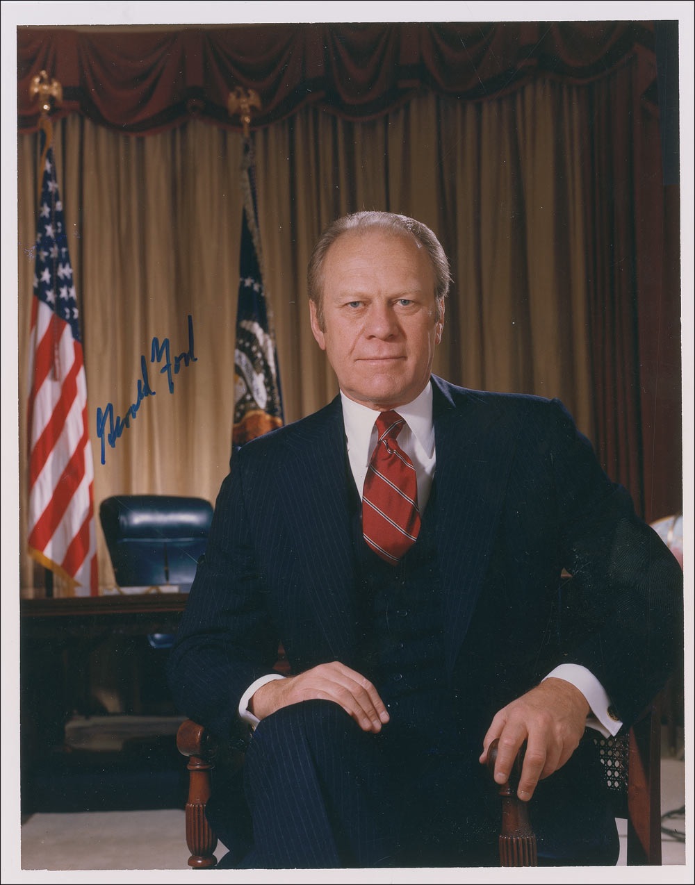 Color satin-finish 8 x 10 photo of Ford sitting in the Oval Office, signed in blue felt tip. In fine condition. RRAuction COA.
