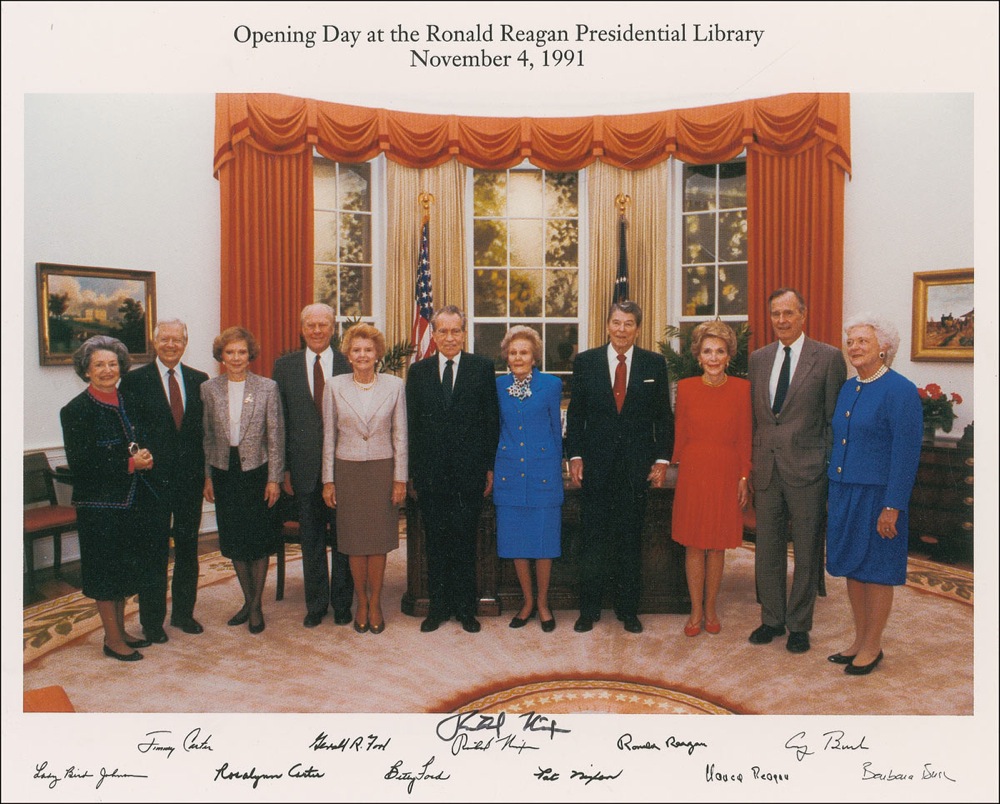 Color 10 x 8 cardstock photo of Presidents Nixon through Bush, together with their wives and Lady Bird Johnson, at the opening of the Ronald Reagan Presidential Library and bearing pre-printed signatures in the lower border, and also signed in black felt tip by Nixon above his pre-printed signature. A light central horizontal bend, otherwise fine condition. Accompanied by a 1992 TLS from Nixon’s personal secretary acknowledging the signature. Pre-certified John Reznikoff/PSA/DNA and RRAuction COA.
