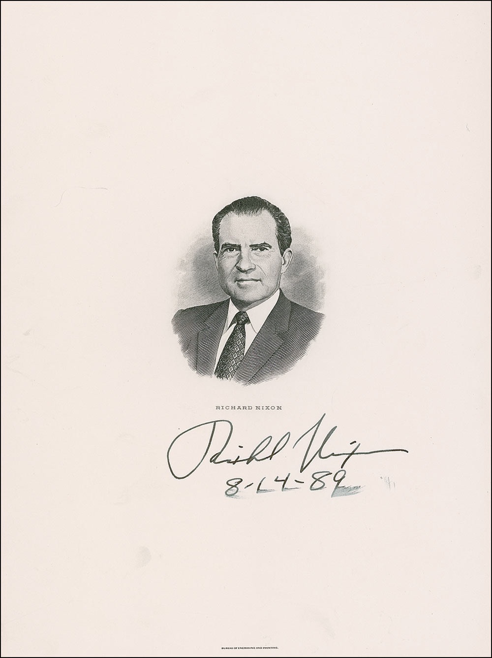 Engraved portrait of Nixon, 6 x 8, by the Bureau of Engraving and Printing, signed in black ink, “Richard Nixon, 8-14-89.” Brushing to bottom of date, otherwise fine condition. Pre-certified John Reznikoff/PSA/DNA and RRAuction COA.