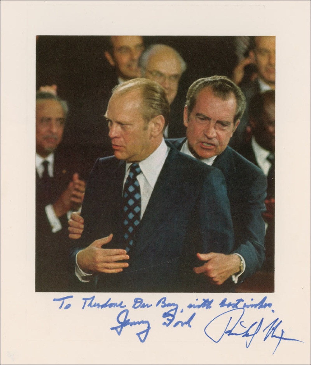Color 6.5 x 7 photo, affixed to an 8.5 x 10.5 mount, signed and inscribed on the mount in blue felt tip “To Theodore Du Bay, with best wishes, Jerry Ford,” and “Richard Nixon.” In fine condition. Pre-certified John Reznikoff/PSA/DNA and RRAuction COA.