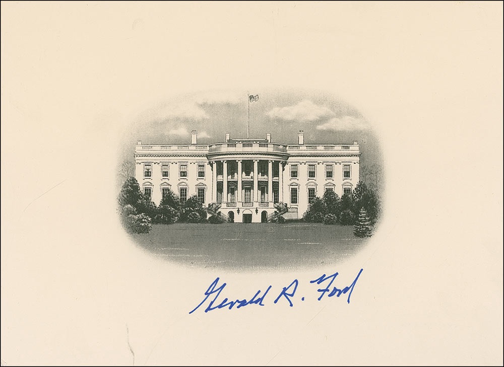 Blank off-white 7 x 5 notecard, bearing an engraved vignette of the White House on the cover, signed under the vignette in blue ink, “Gerald R. Ford.” In very fine condition. RRAuction COA.