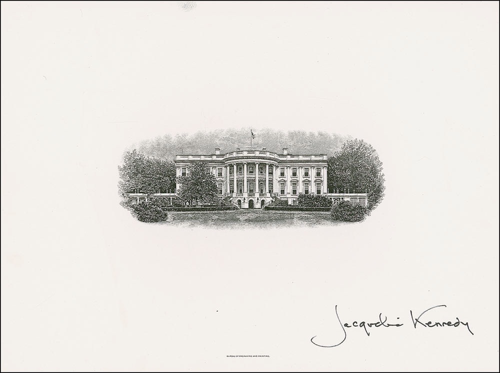 Engraved portrait of the White House, 8 x 6, by the Bureau of Engraving and Printing, signed in the lower right corner in black ink, “Jacqueline Kennedy.” In fine condition, with trivial fingerprint to top edge. Pre-certified John Reznikoff/PSA/DNA and RRAuction COA.